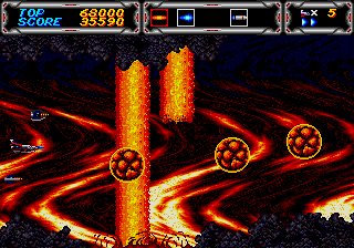 Gorgon is one of the planets from the ORN System, being a volcanic planet. This is the first level in the game where the player must watch over for the terrain, with many fire pillars ascending from the lava pits and molten rocks flying about besides the usual waves of enemies. Halfway through the scrolling speeds up until the midboss is defeated.