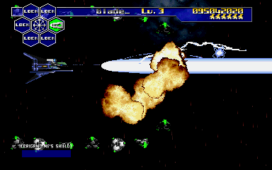 This stage takes place high above the Earth, where the Vambrace engages in battle against the Sword Fleet. The player begins the level controlling the Brigandine, which has a health meter in the bottom-left. By using its powerful laser the player can easily plow through the many enemy waves. Close to the end of the level the Guardian-controlled Rynex will engage the player before leaving and returning for the boss fight.